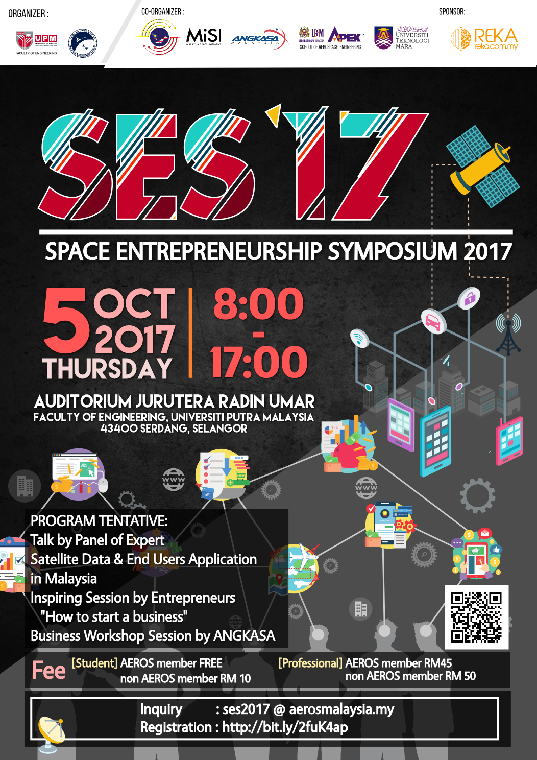 The Space Entrepreneurship Symposium 2017 (SES 2017) will be held on the 5th of October at the Faculty of Engineering, Universiti Putra Malaysia. This symposium on space entrepreneurship is one of the first in Malaysia, with discussions on topics around space technology advancements and entrepreneurship to ignite inspiration in students and professionals to push this industry forward.